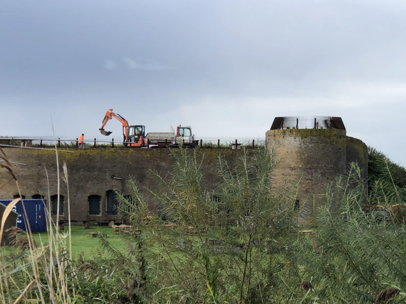 Het dak van de bomvrije kazerne is lek. De lekkage van het dak kan het beste opgelost worden door het grondpakket volledig te verwijderen, een nieuwe waterdichte laag aan te brengen op de blootgelegde gemetselde gewelven en het grondpakket weer terug aan te brengen. Als het fort over een paar maanden prachtig is gerestaureerd en opgeknapt is er niks meer te zien van de lekkage, maar voorlopig is het dakterras verboden terrein.